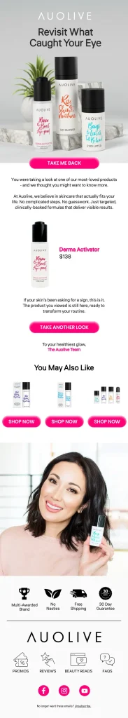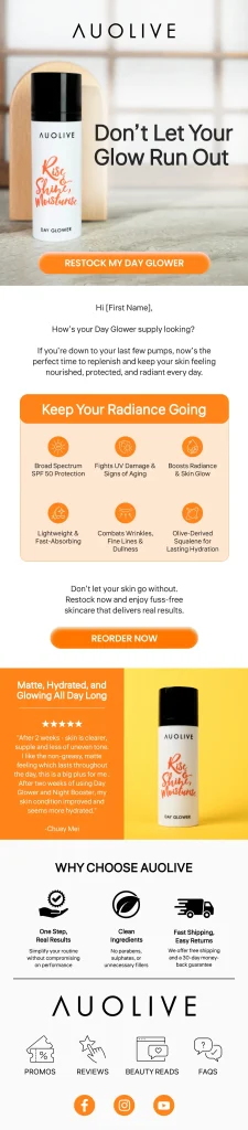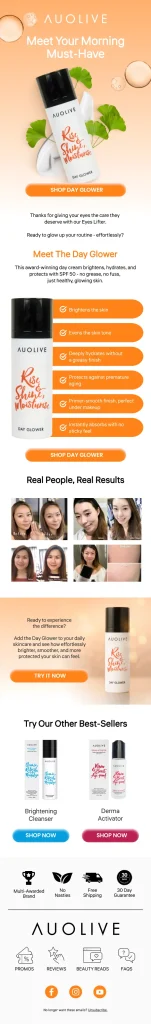 All results are based on internal reporting via Klaviyo Analytics and Business Performance dashboards. Data spans from May to September 2025 and reflects performance across Auolive’s flow and campaign email programs. These figures have not been independently audited or third-party verified. Individual results may vary depending on list quality, product type, email volume, and seasonality.